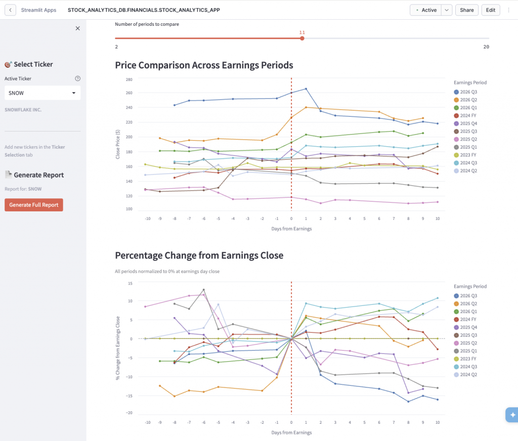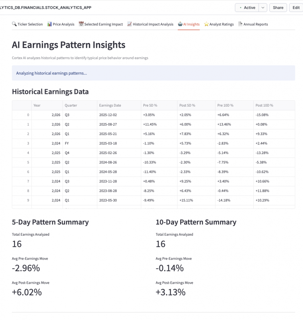 - AI Earnings Pattern Insights – Cortex AI analysis of price behaviour
