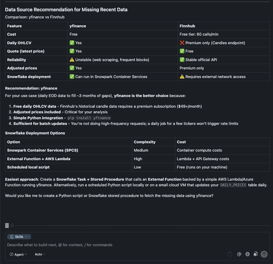 Duh! yes please, write the python script for me CoCo…… and off it went to write the script and deploy it in Snowpark Container Service (SCS), fetched the missing data and updated the ticker tables….